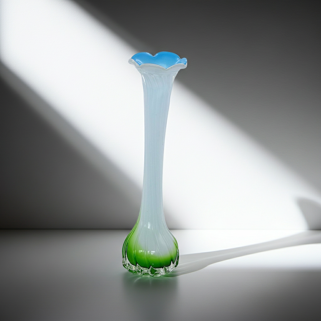 Bring a touch of delicate artistry into your space with this stunning Vintage Handblown Glass Bud Vase, featuring a tall, slender silhouette and a graceful color fade from soft green at the base to icy white and a splash of sky blue at the rim. The fluted body and ruffled edge add a dreamy, floral-inspired elegance that makes this piece truly one of a kind.