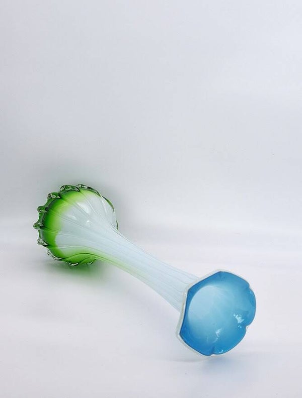 Vintage Handblown Glass Bud Vase – Blue, White & Green Fade with Ruffled Rim