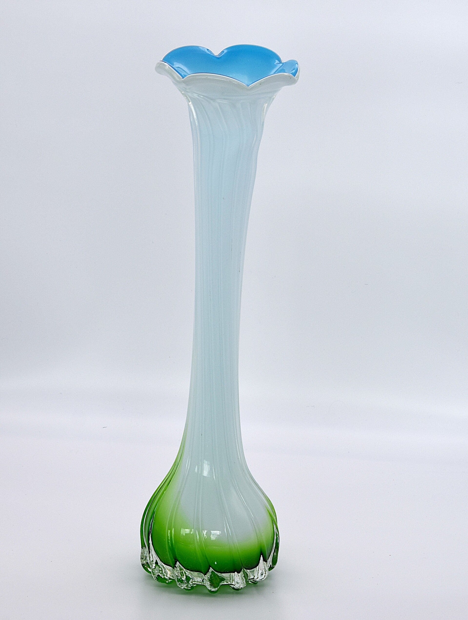 vintage handblown glass vase, blue green white bud vase, ruffled edge glass vase, mid-century art glass decor, Murano-style vintage vase, tall colored glass flower vase, TheyUnique vintage glassware, collectible retro bud vase