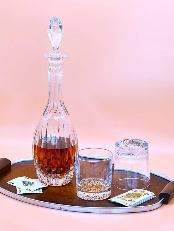 The intricately faceted body beautifully catches and reflects the light, turning even simple shelves or bar carts into statement displays. Finished with a classic crystal stopper to lock in aroma and flavor, this piece blends functionality with pure elegance.