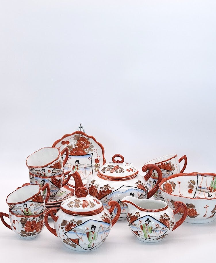 Japanese Kutani tea set, Kutani porcelain, hand-painted Japanese teaware, 20th century tea set, vintage Asian ceramics, Japanese tea ceremony, collectible porcelain, traditional Japanese decor, Kutani yaki, TheUnique vintage