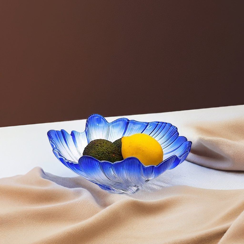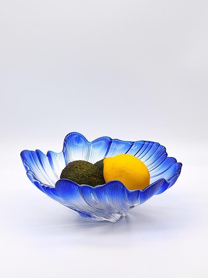 Whether used as a centerpiece, fruit bowl, or simply admired as a decorative object, this piece balances function and form in perfect harmony. Its hand-formed lines and play of light through the dual tones of blue and clear glass create a visual rhythm that’s both calming and captivating.