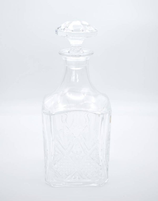 Crafted from high-quality French crystal, it features a geometric cut-glass design that sparkles in the light, and a solid stopper that adds both function and sophistication. Whether used to serve fine whiskey or simply styled as a decorative statement on a drinks trolley or shelf, this decanter brings a sense of refined luxury and vintage charm to any space.