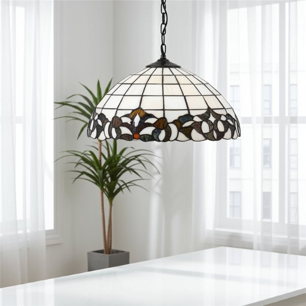 The warm, diffused glow from the stained glass shade creates an inviting atmosphere in any room — whether above a dining table, in a cozy hallway, or as a statement piece in your living room. The classic floral and geometric motif, adds vintage charm and a touch of artistry to both traditional and modern interiors.
