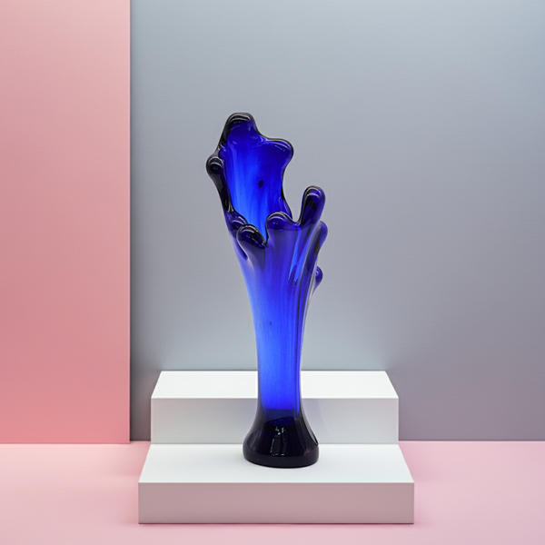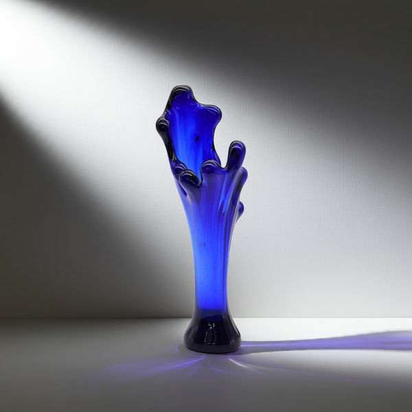 Make a bold design statement with this striking swung vase in vibrant cobalt blue art glass, a true representation of mid-century modern glass design. Characterized by its elegant vertical stretch and fluid, organic form, each swung vase is unique — shaped by gravity and glass-blowing technique.