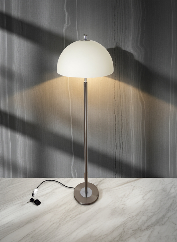 Crafted with a translucent acrylic dome and sturdy metal base, this vintage floor lamp serves both as a functional lighting piece and a collectible work of design art. The soft, diffused light adds warmth and atmosphere to any interior—whether you're styling a retro-inspired home or blending old and new in a modern eclectic space.