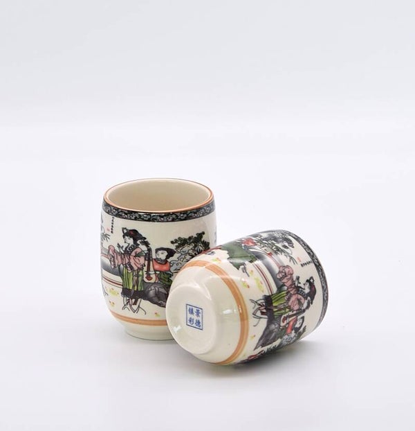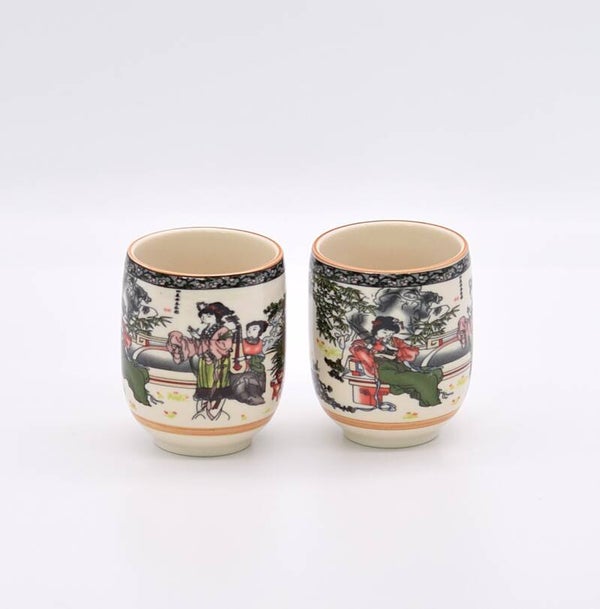 Crafted from fine porcelain and finished with vibrant scenes, the cups depict traditional Geisha figures in ornate dress, surrounded by tranquil garden elements and symbolic motifs. Subtle gold rim accents and soft glaze finish reflect a refined sense of culture and tradition.
