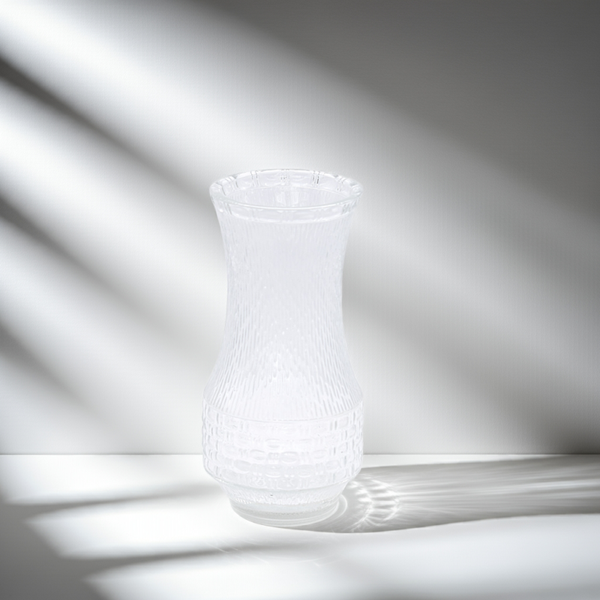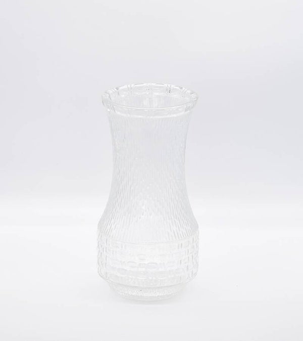 Bring timeless charm to your home with this 1960s Mid-Century Modern patterned pressed glass vase. Crafted with precision, its elegant textured design reflects the light beautifully, making it a versatile piece for both decorative and functional use.