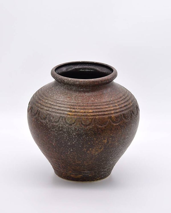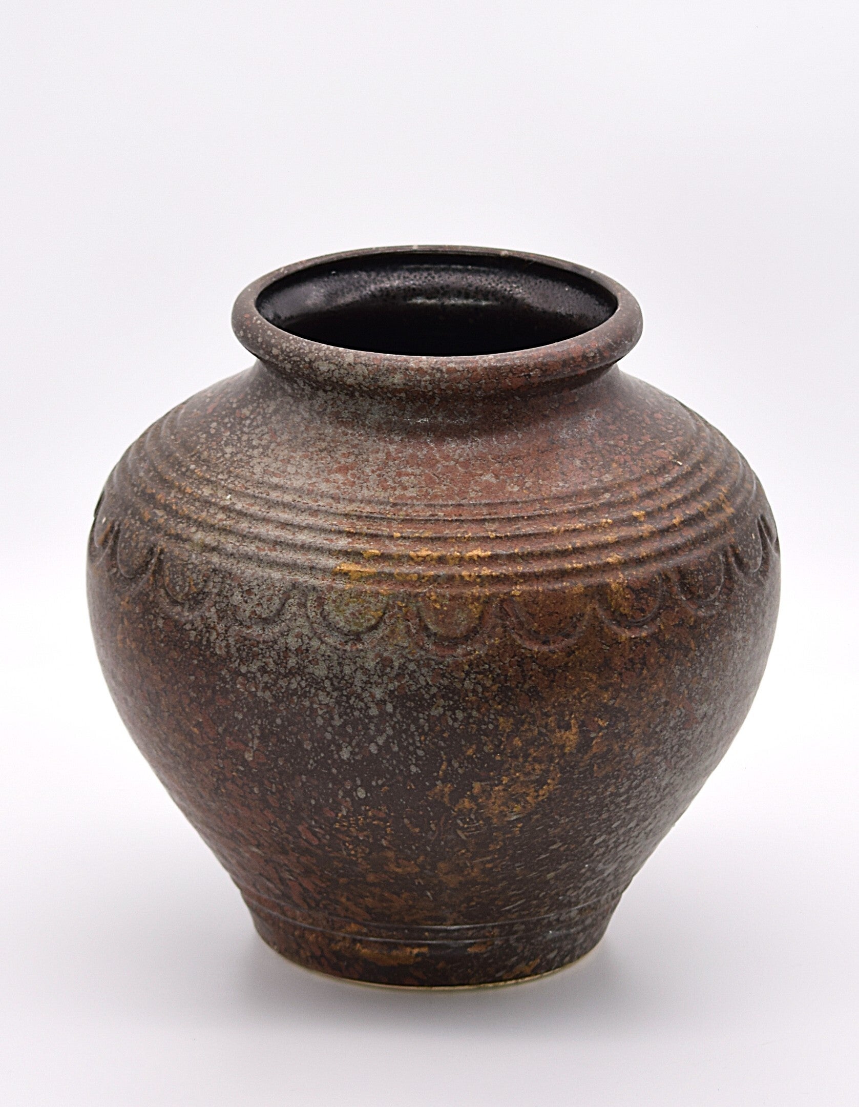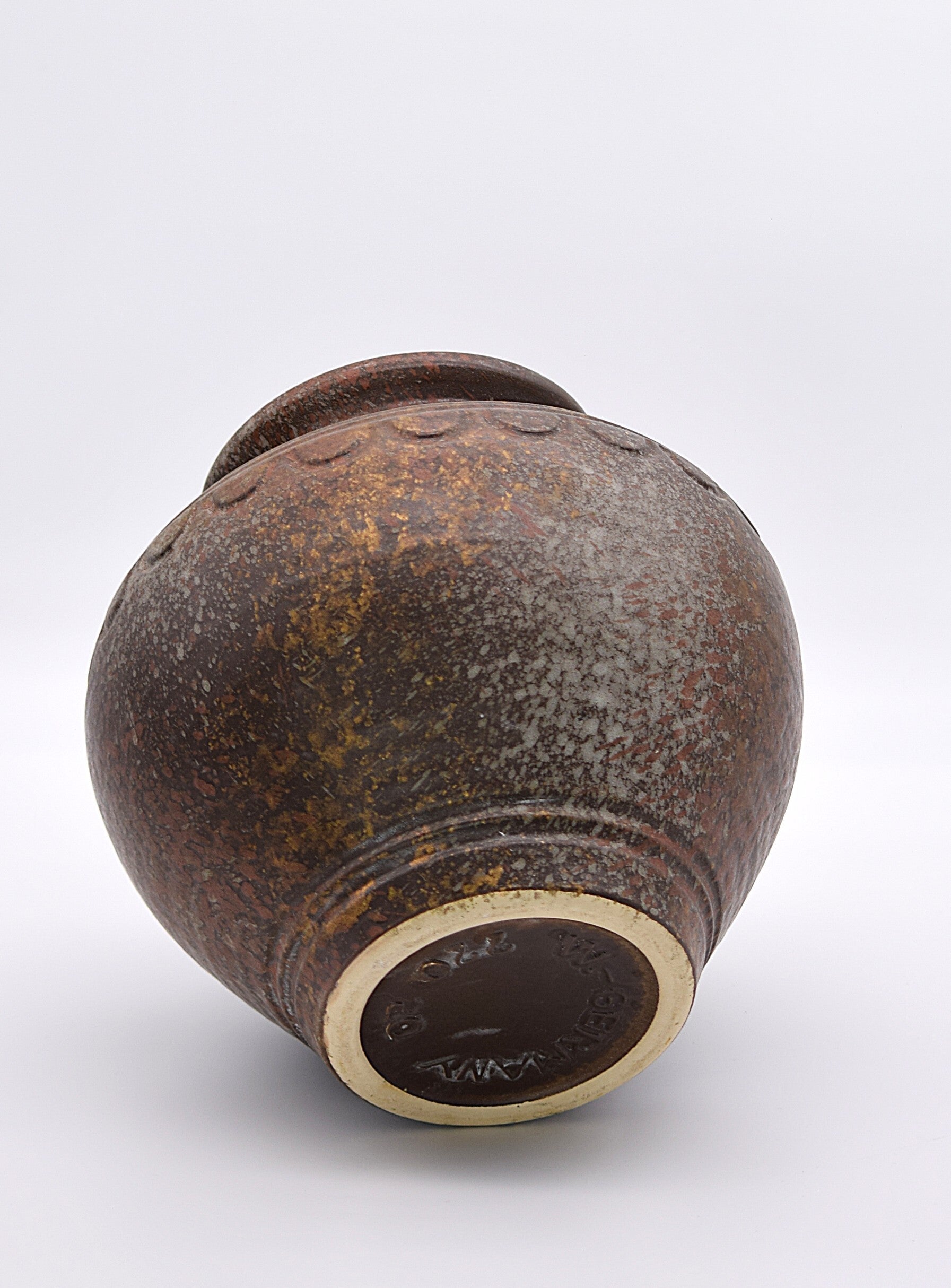 Its bronze and gold glaze exudes warmth and sophistication, making it a perfect accent piece for interiors ranging from vintage and retro to modern and eclectic. The structured ceramic surface adds depth and texture, while its proportions highlight the balance and beauty of mid-century German design.
