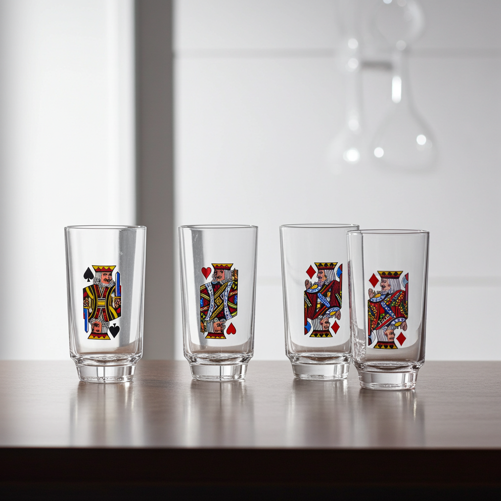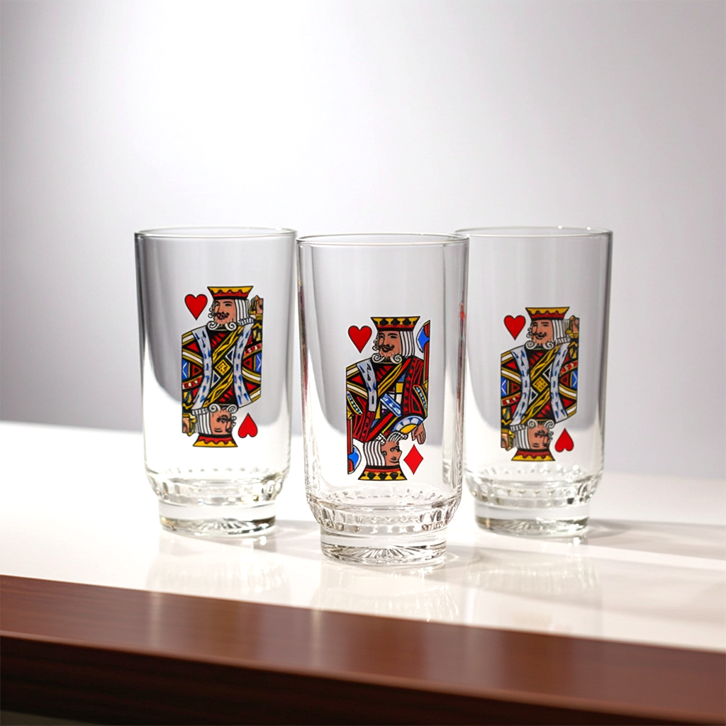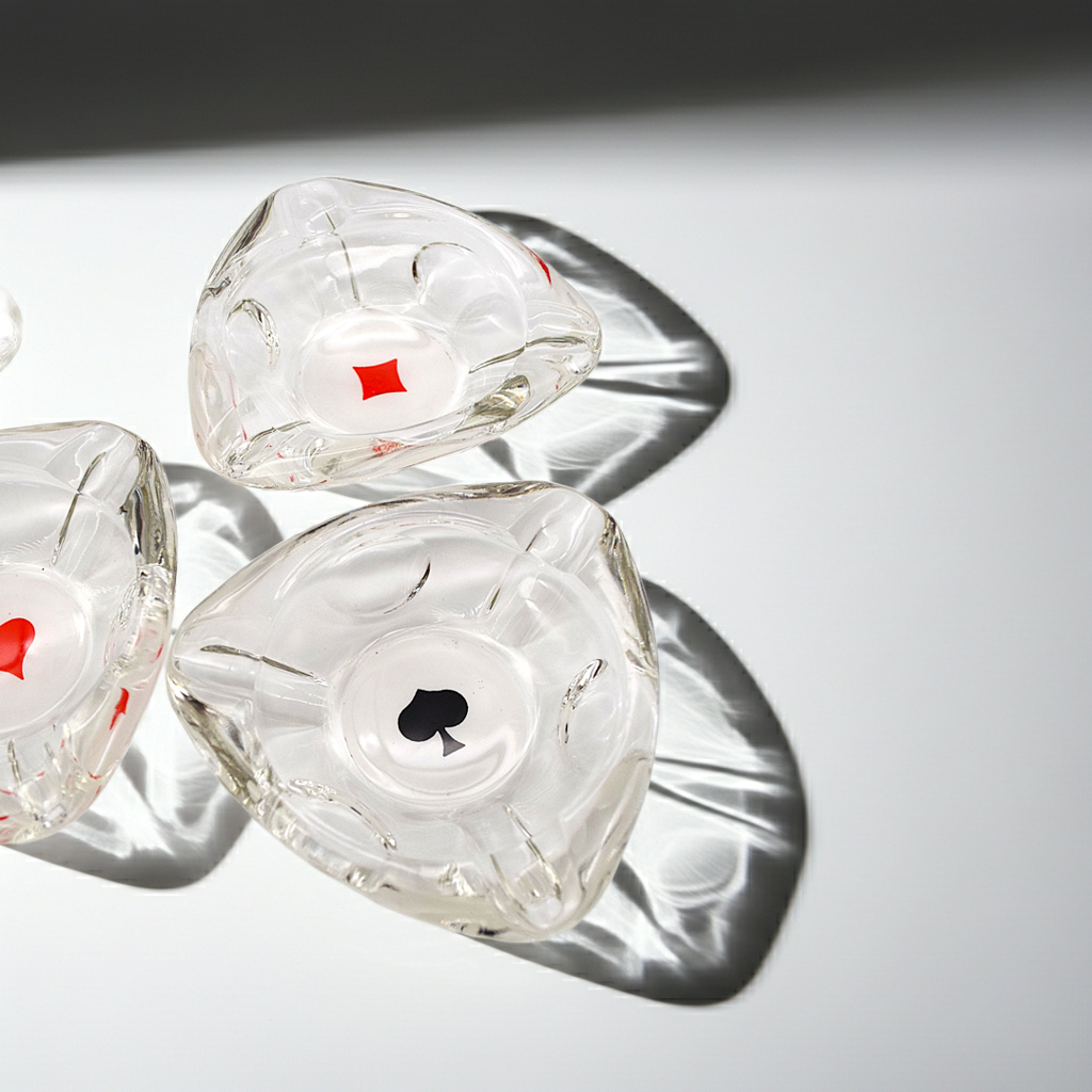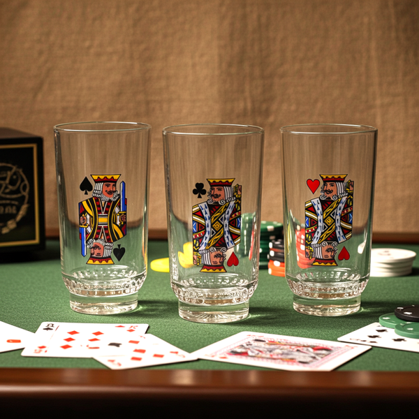Each glass features bold casino-inspired designs — playing cards, poker chips, and vibrant retro motifs that evoke the glamour of classic Las Vegas nights.