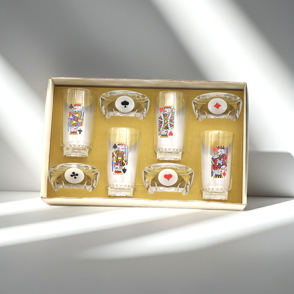 Mid-Century Modern "Bridge" Casino Poker Bar Set – 4 Drinking Glasses & 4 Ashtrays in Original Box