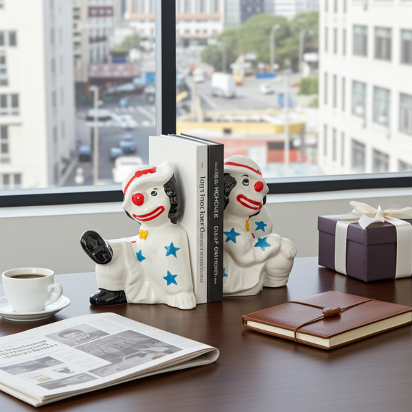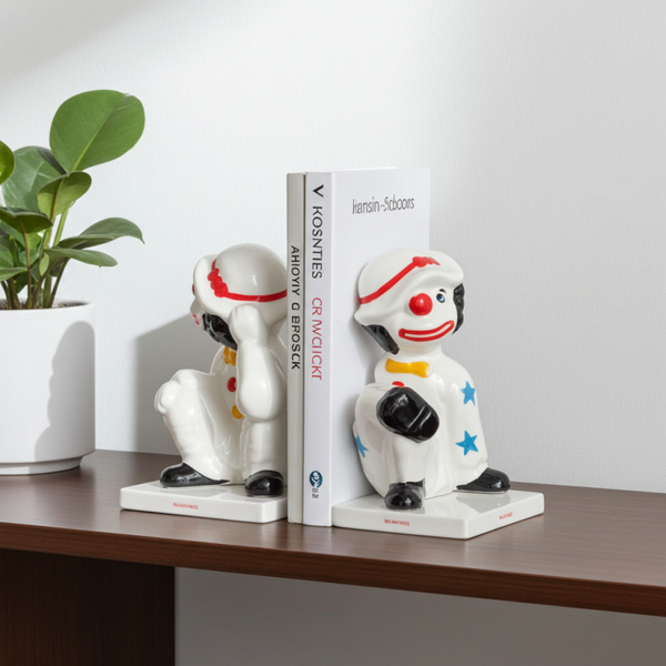 vintage ceramic clown figurines, clown bookends vintage, retro ceramic décor, hand-painted clown statues, whimsical bookends, vintage bookshelf décor, character figurines, TheyUnique vintage décor, collectible clown figurines, quirky home accessories