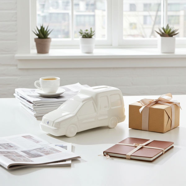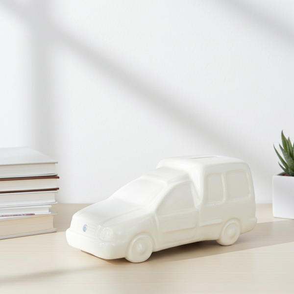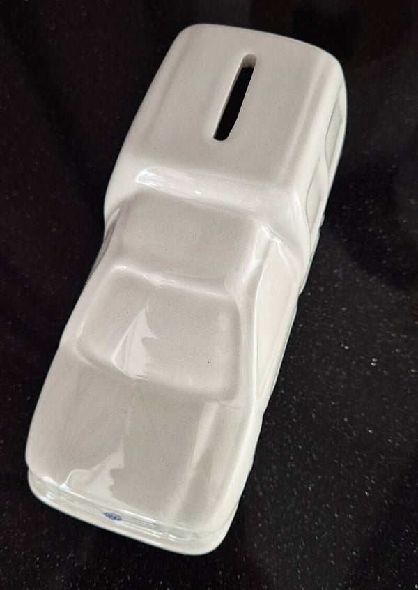 vintage ceramic piggy bank, VW Caddy money box, Volkswagen piggy bank, ceramic car money box, retro coin bank, white ceramic decor, quirky home accessories, La Moustache piggy bank, collectible piggy banks, TheyUnique décor