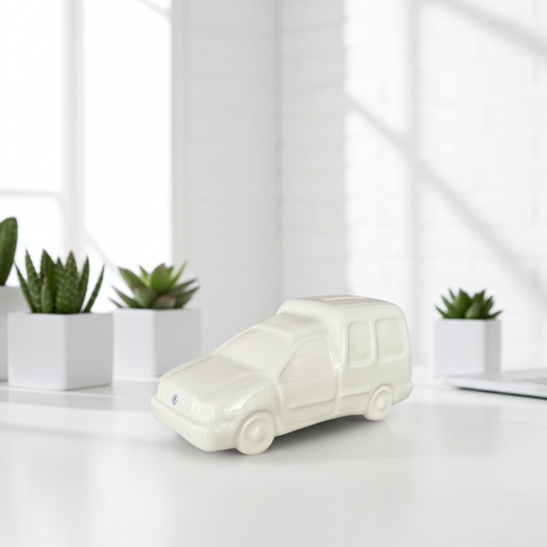 Bring a touch of playful vintage charm into your home with this Vintage White Ceramic Volkswagen Caddy Piggy Bank “La Moustache.” Designed in the shape of the iconic VW Caddy, this ceramic money box stands out with its smooth white glaze, charming detail, and retro character.