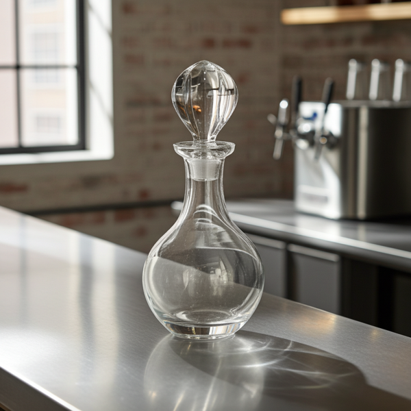 Place the decanter on a wooden or marble bar tray alongside matching glasses. Add a brass jigger or vintage bar tools to complete an elevated bar cart display.
