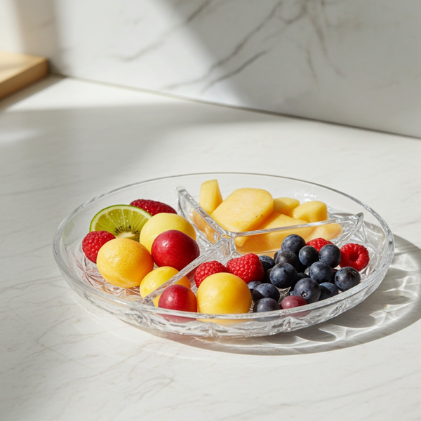 Perfect for serving nuts, dried fruits, olives, dips, or sweets during dinners and celebrations. Its clear glass complements any table setting.