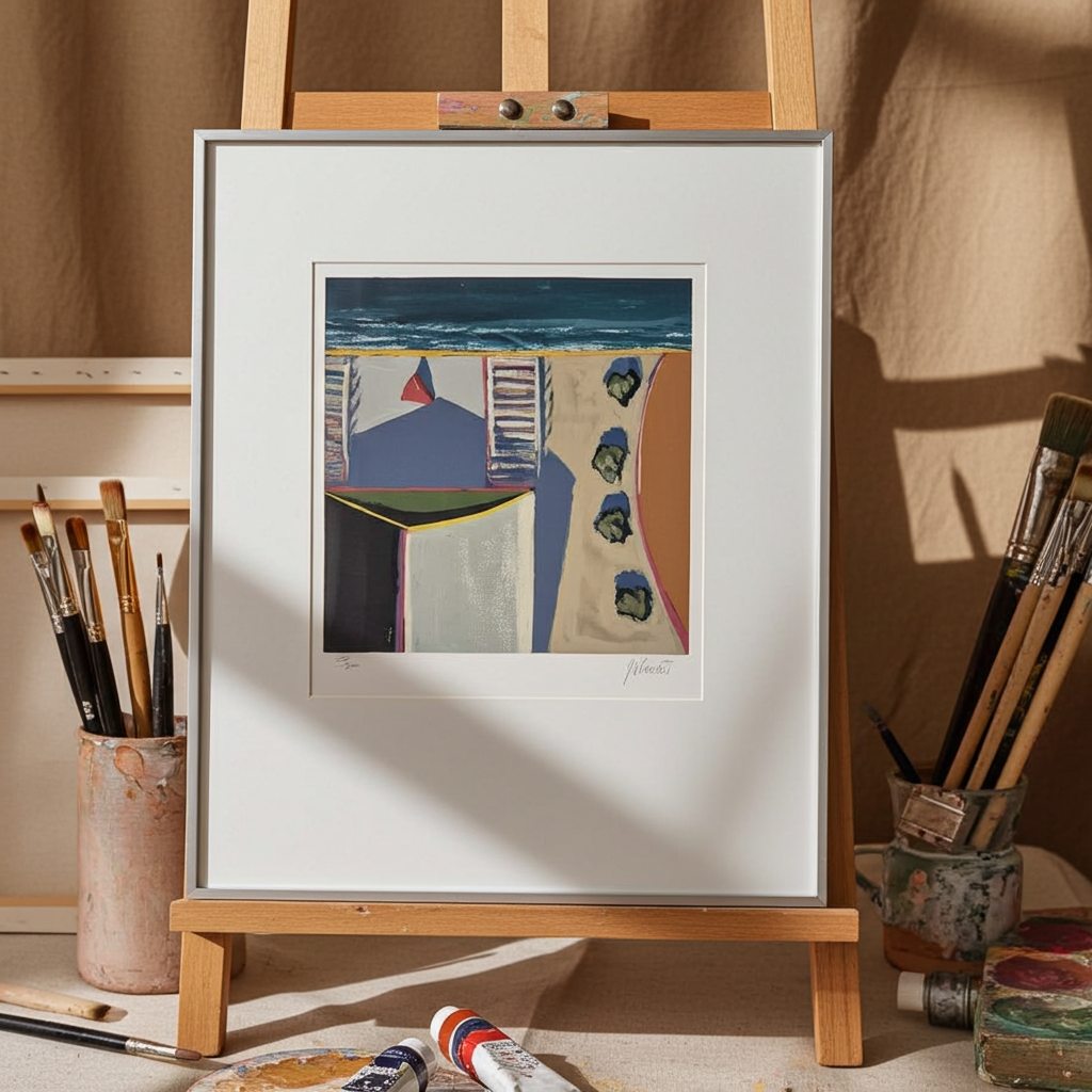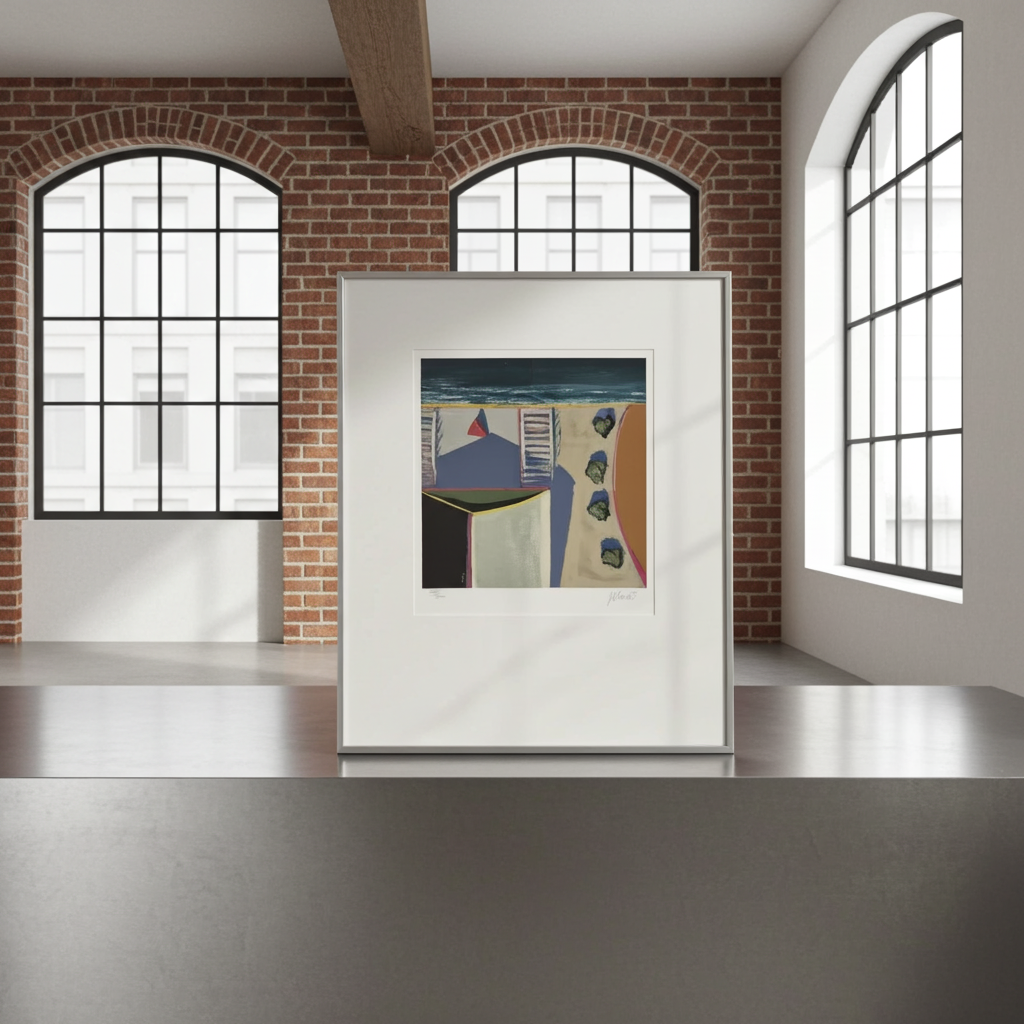 This elegant framed screenprint titled “Beach Scene” by Douglas K. Morris is a refined example of modern coastal-inspired art. Using the silkscreen technique on paper, Morris creates a balanced composition that evokes calm, light, and a timeless seaside atmosphere.