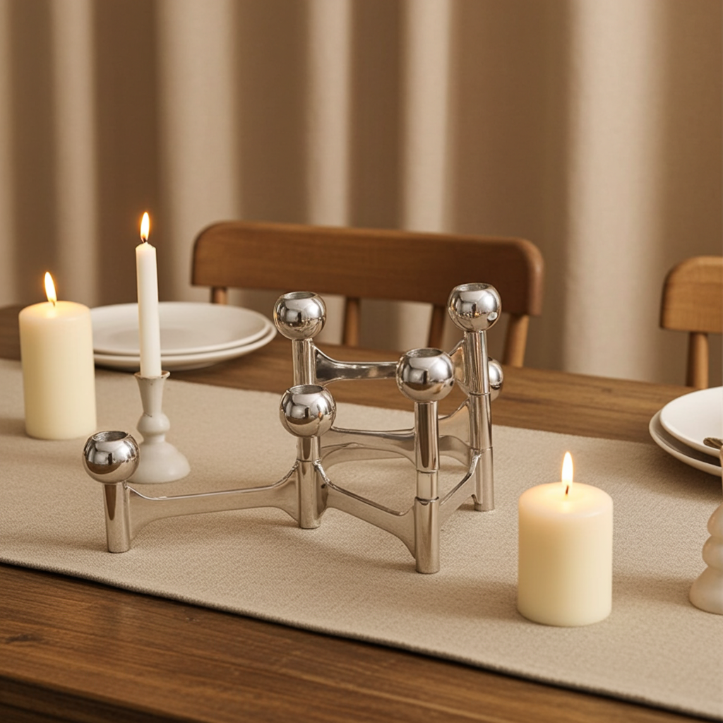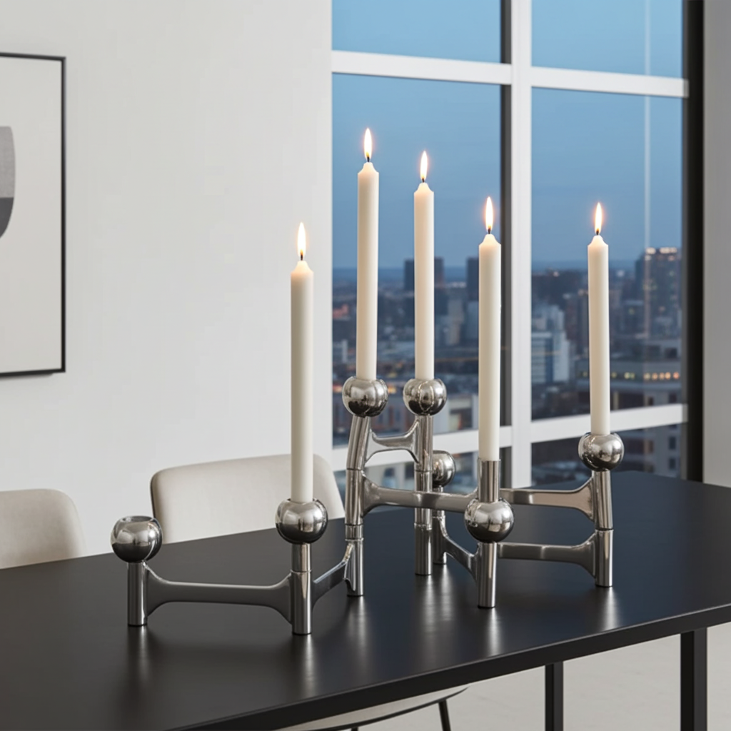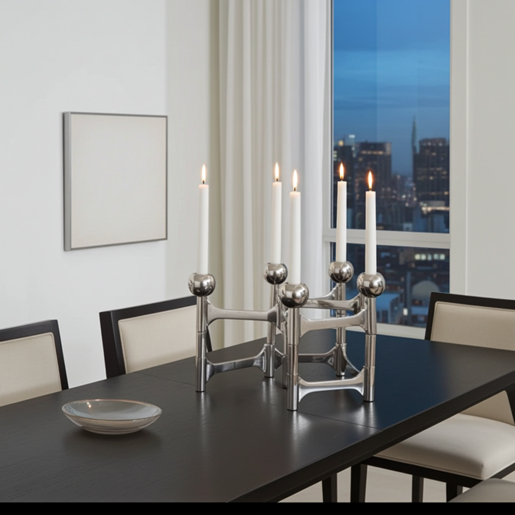 With its elongated form and clean lines, this candelabra brings architectural interest to dining tables, sideboards, or consoles. The folding mechanism makes it versatile and dynamic, while the balanced proportions create a strong visual rhythm when candles are lit.