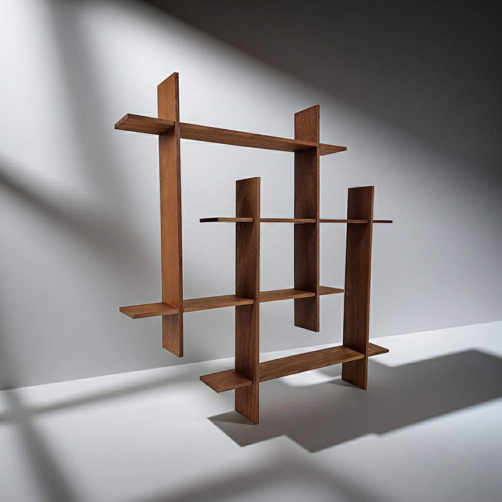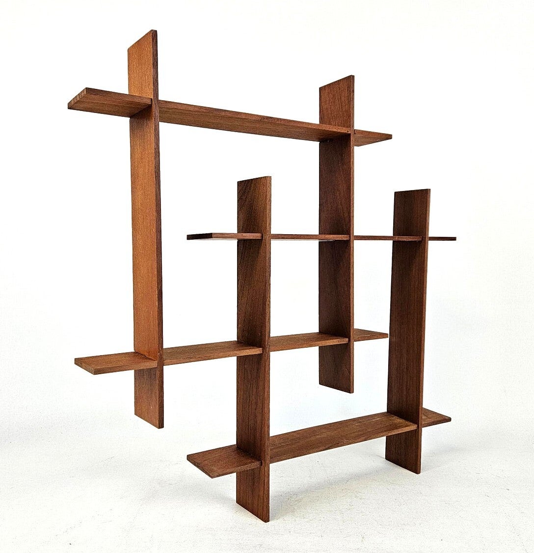 This mid-century modern wall shelf from the 1960s is a beautifully designed piece crafted from warm teak wood, showcasing the clean lines and functional elegance that define the era. Composed of eight individual parts, the shelf has a subtle modular character, giving it architectural depth while remaining visually light.