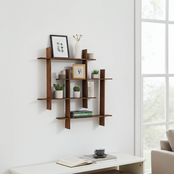 The natural teak grain adds warmth and texture, making this shelf both practical and decorative. Its compact square format makes it ideal for smaller spaces, while the layered construction creates interest on the wall even when styled minimally.