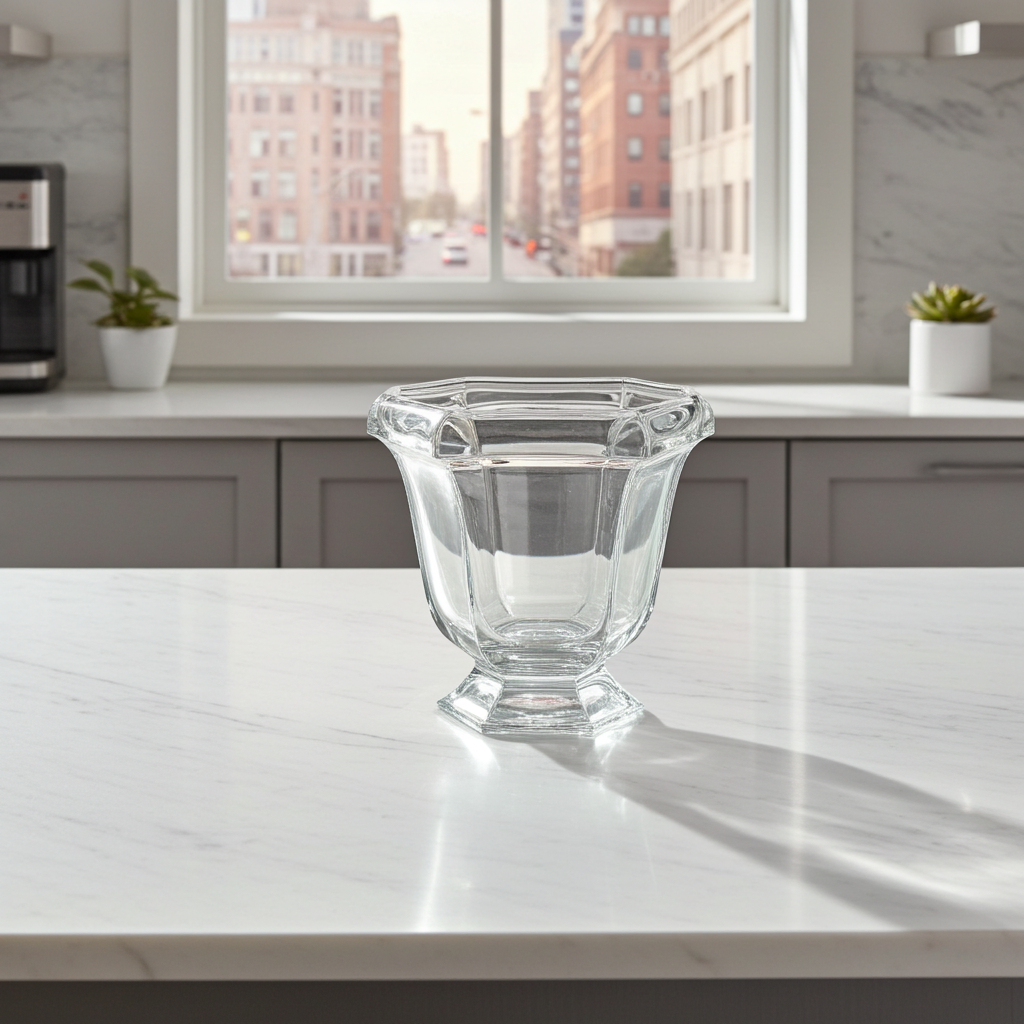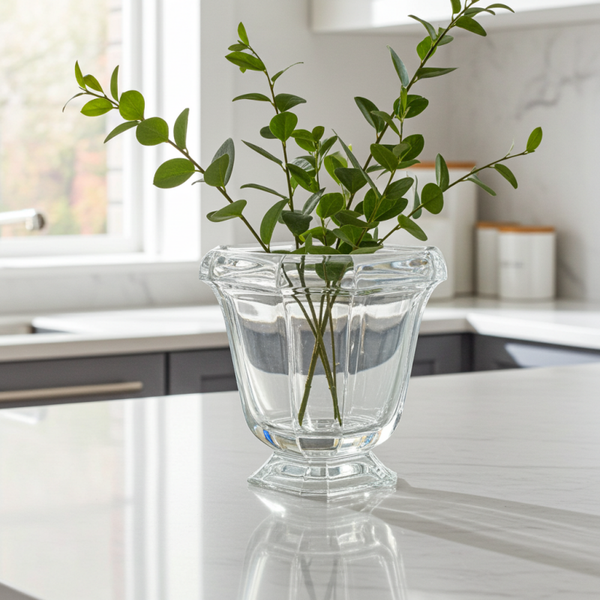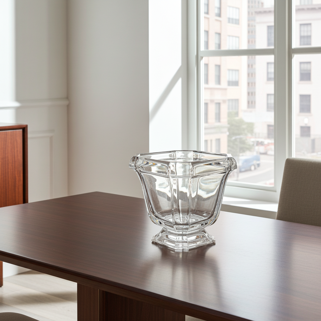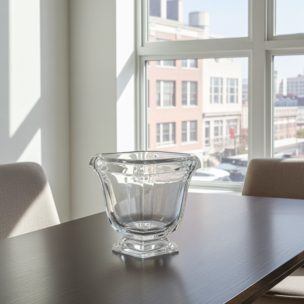 The crystal surface catches and reflects light beautifully, enhancing floral arrangements while standing out as a sculptural object on its own. Its generous size and harmonious silhouette make it ideal for statement bouquets, branches, or as a standalone centerpiece.