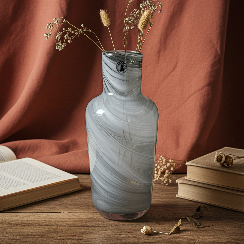 Crafted using traditional glassblowing techniques, the vase combines artisanal craftsmanship with contemporary design. Its slender silhouette and balanced proportions make it ideal for both floral arrangements and sculptural display. The subtle play of light across the swirling glass surface adds depth and sophistication to any interior.